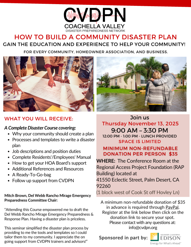Our Mission CVDPN is an all-volunteer organization whose mission is to provide all citizens of the Coachella Valley with training, education, and networking opportunities to be prepared for all disasters. CVDPN’s goal is to teach personal and community preparedness with the “No Community Left Behind” all-inclusive training in English and Spanish. We are educators, not first responders. We support all first responders.