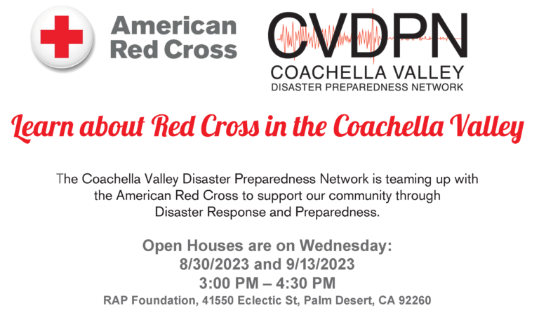 American Red Cross Open House Learn more about American Red Cross services and volunteer opportunities at an upcoming Open House hosted by CVDPN. Use the form below to register for this event. Space is limited and only the first 60 will be guaranteed. Registration for this event is free! Please enable JavaScript in your browser to complete this form.Pick a Date! Sessions times are 3:00 PM - 4:30 PM hosted by CVDPN at RAP Foundation, 41550 Eclectic St, Palm Desert. *8/30/239/13/23Name *FirstLastPhone NumberEmail *AddressCityZIP CodeCommunity or HOAQuestions or Comments?Submit